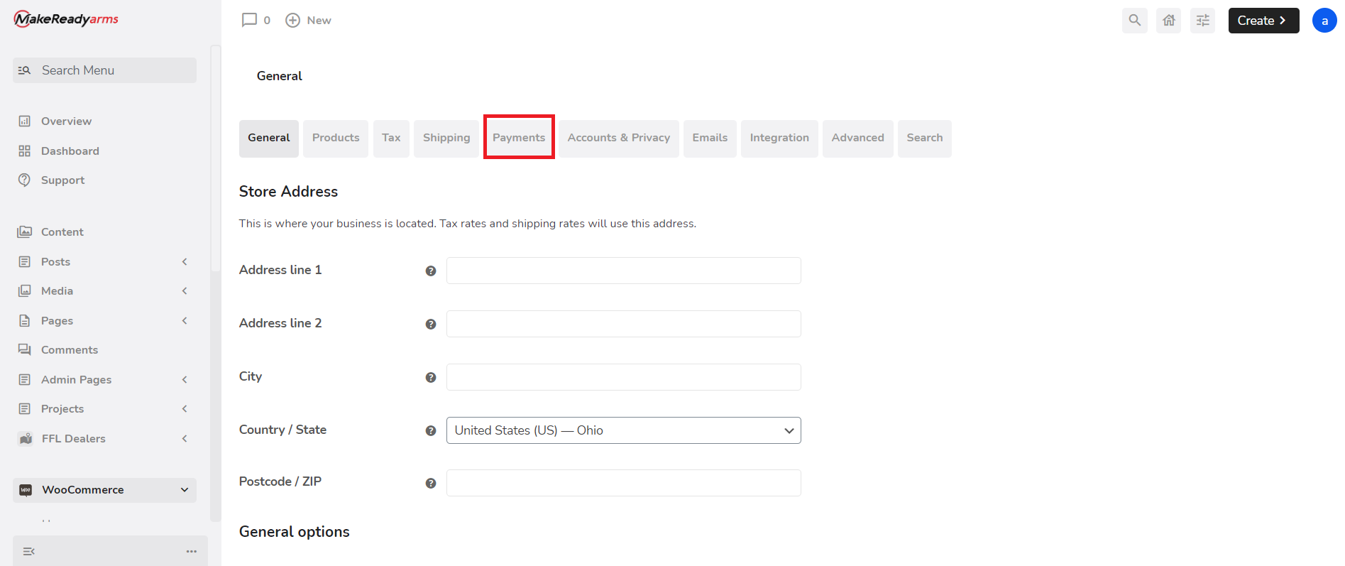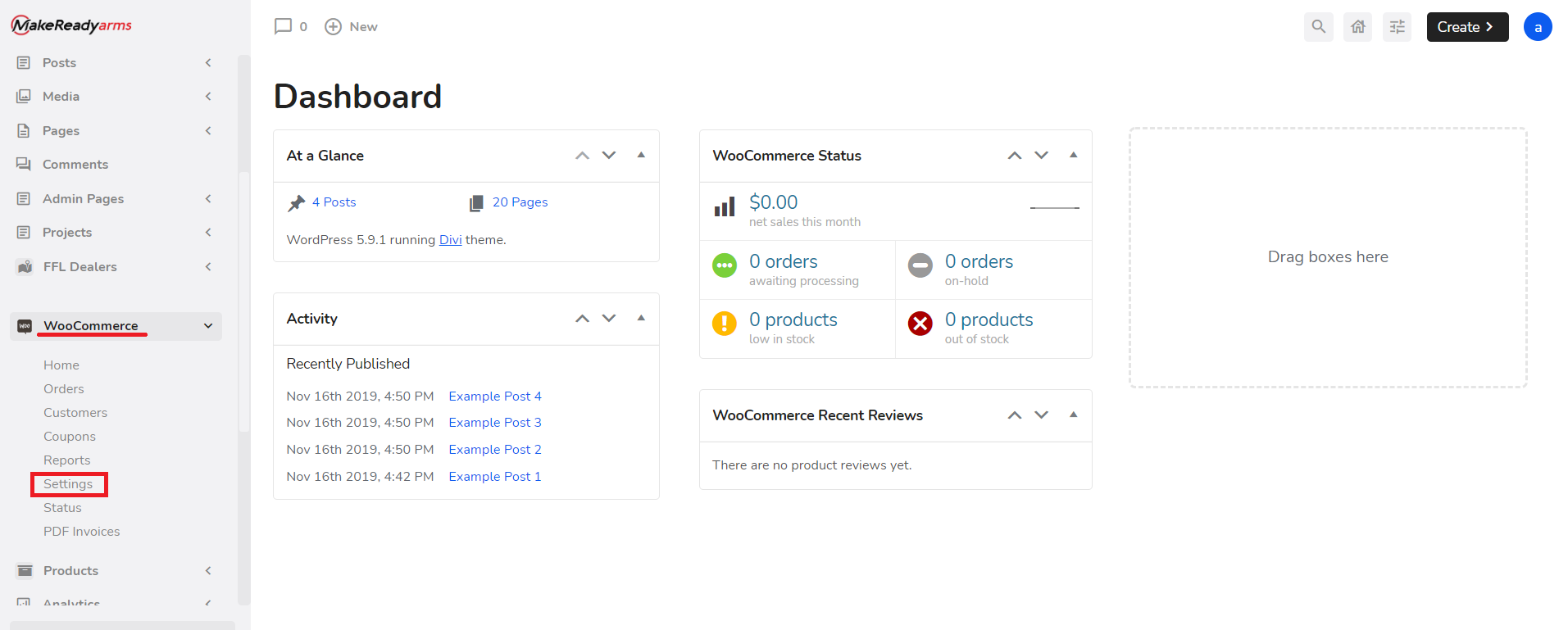 First you will login to your admin dashboard. Then on the left hand side click "WooCommerce" then"Settings".